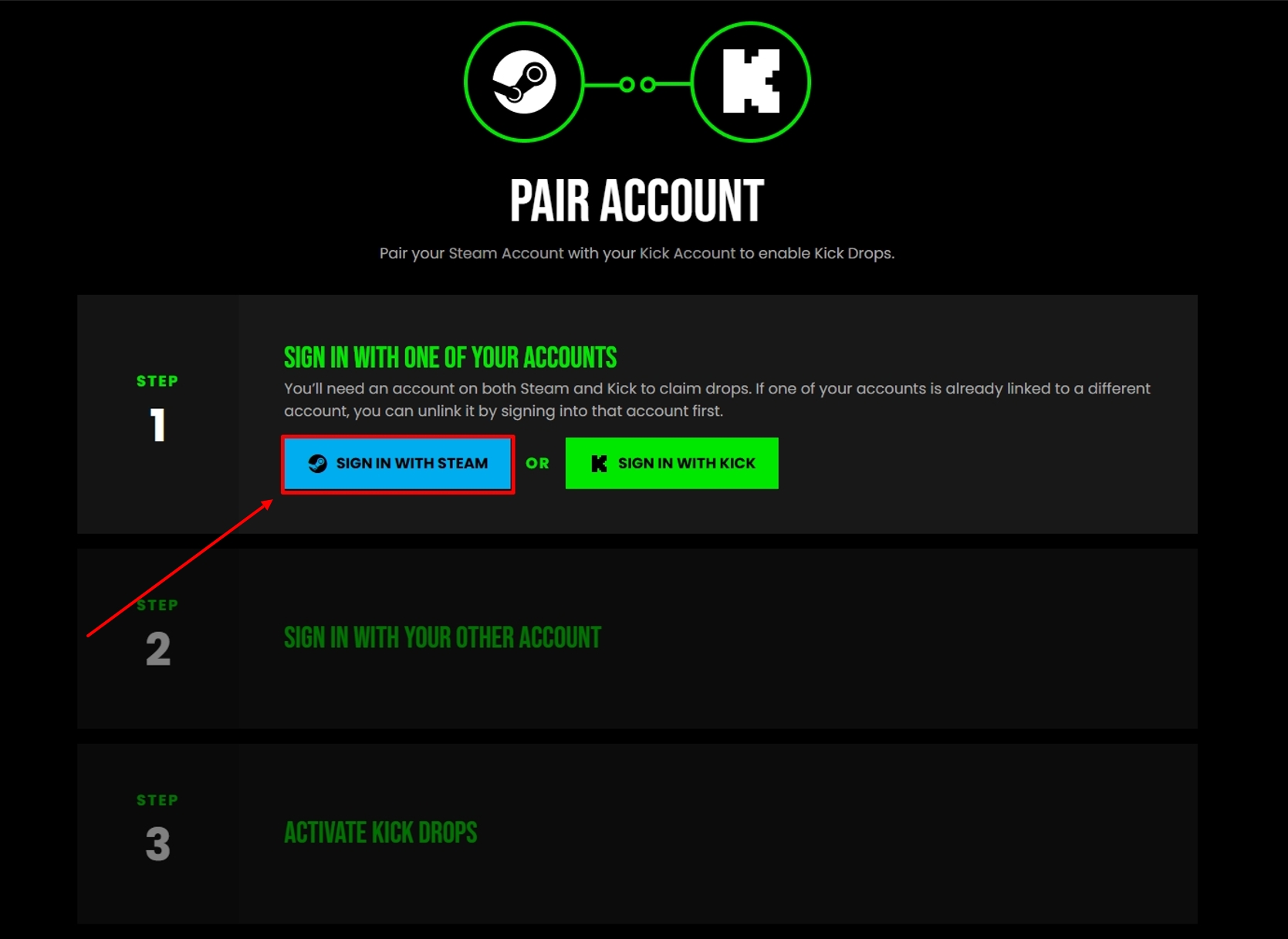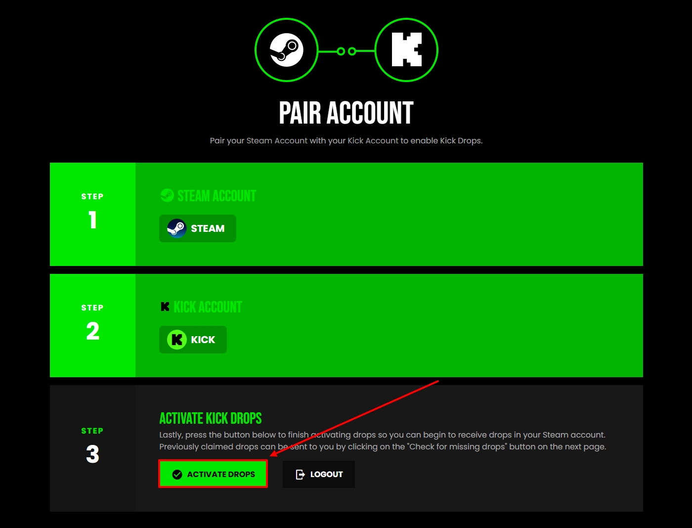 - Click on the “ACTIVATE DROPS” button. If you are not redirected to the right page, open it yourself using the link kick.facepunch.com/connect or click on "CONNECT ACCOUNT" at the top.