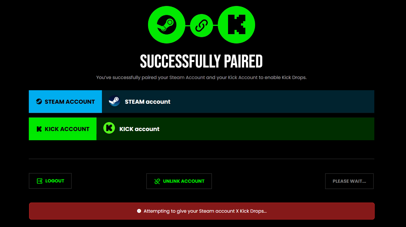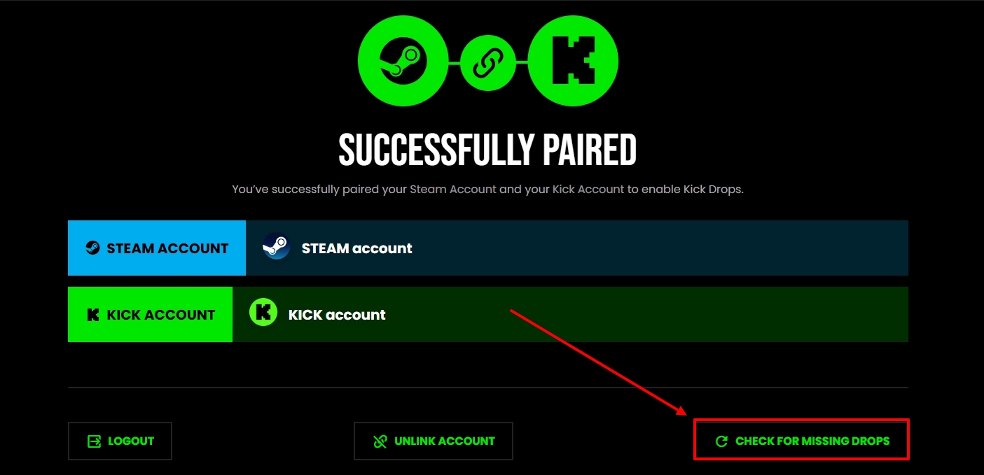 - If after pressing the “CHECK FOR MISSING DROPS” button you see the message "Attempting to give your Steam account X Kick Drops...", then all the skins are already in your account's STEAM inventory.