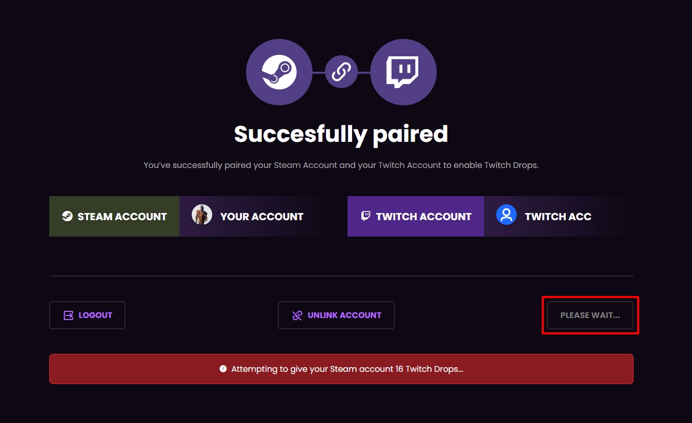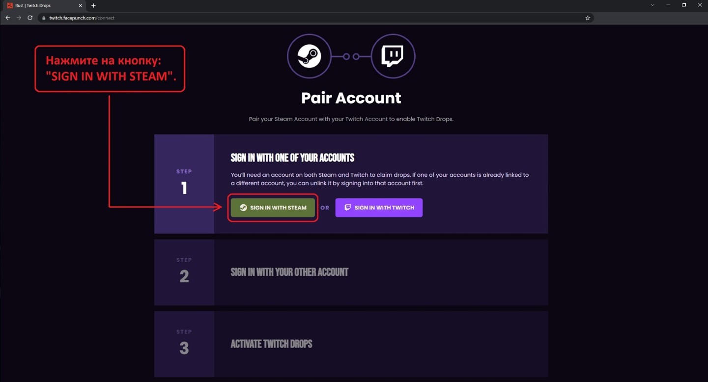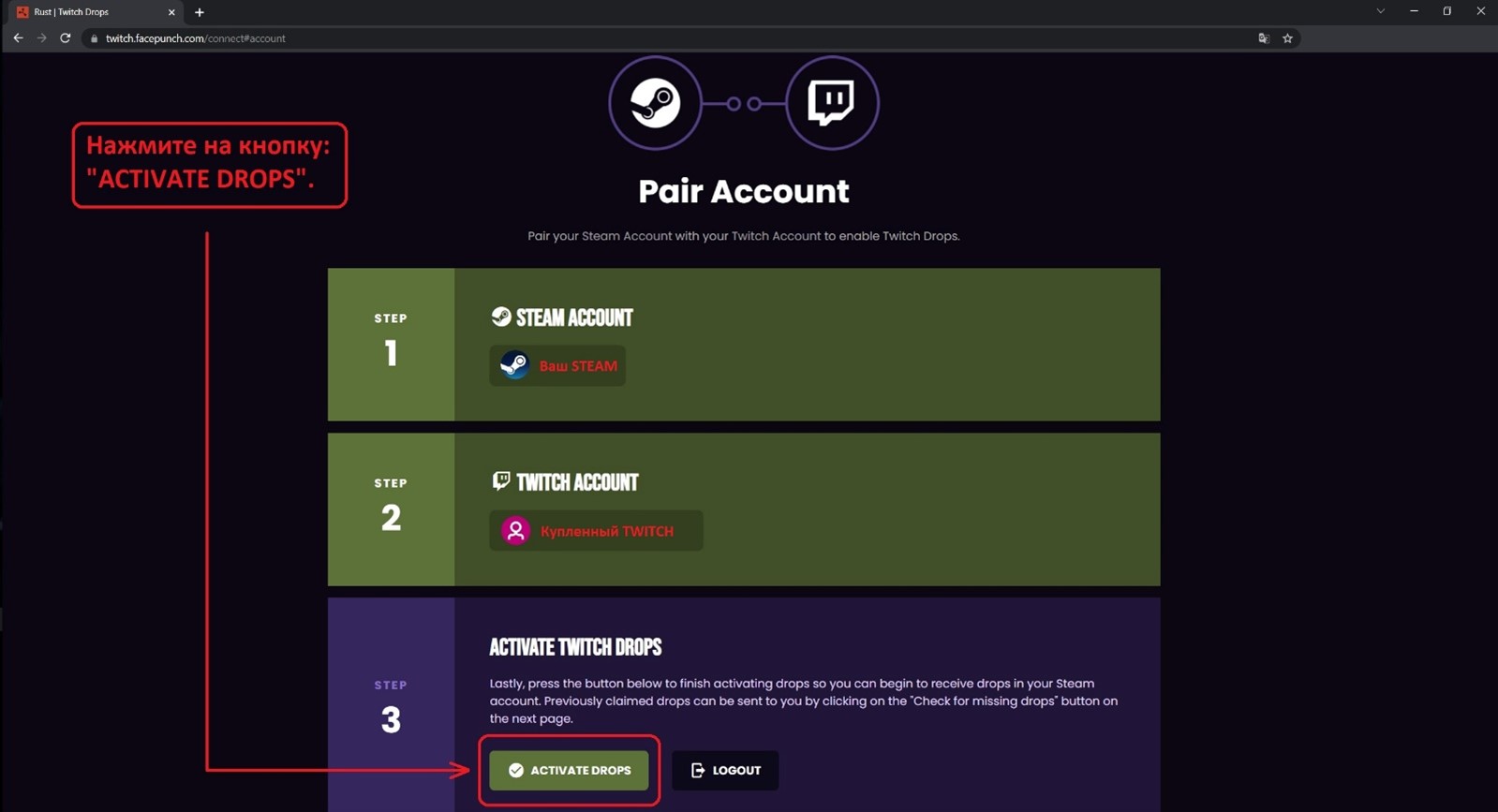 ОЧЕНЬ ВАЖНО! ПОДКЛЮЧАТЬ СНАЧАЛА НУЖНО ВАШ STEAM АККАУНТ, А НЕ КУПЛЕННЫЙ TWITCH АККАУНТ, ИНАЧЕ ВЫ НЕ СМОЖЕТЕ ПОЛУЧИТЬ ПРЕДМЕТЫ