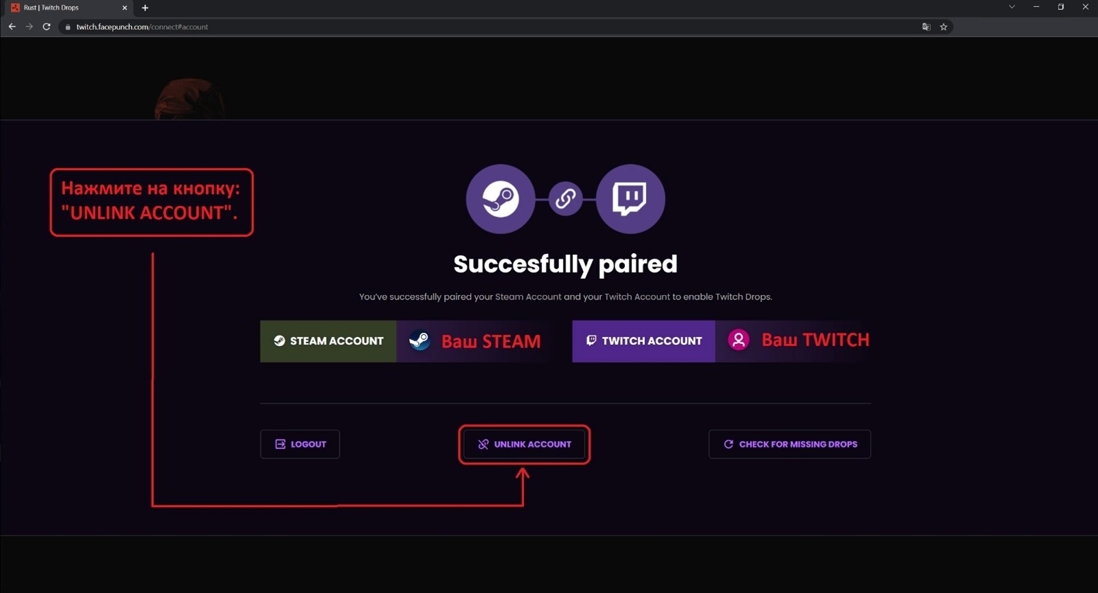 В случае, если вы попали на другую страницу, не подобную картинке ниже, то есть у вас нету кнопки “UNLINK ACCOUNT” / ”ОТПРАВИТЬ АККАУНТ”, то проигнорируйте этот шаг №6 и картинку ниже. Переходите сразу к шагу №7 (то есть, к следующему шагу).